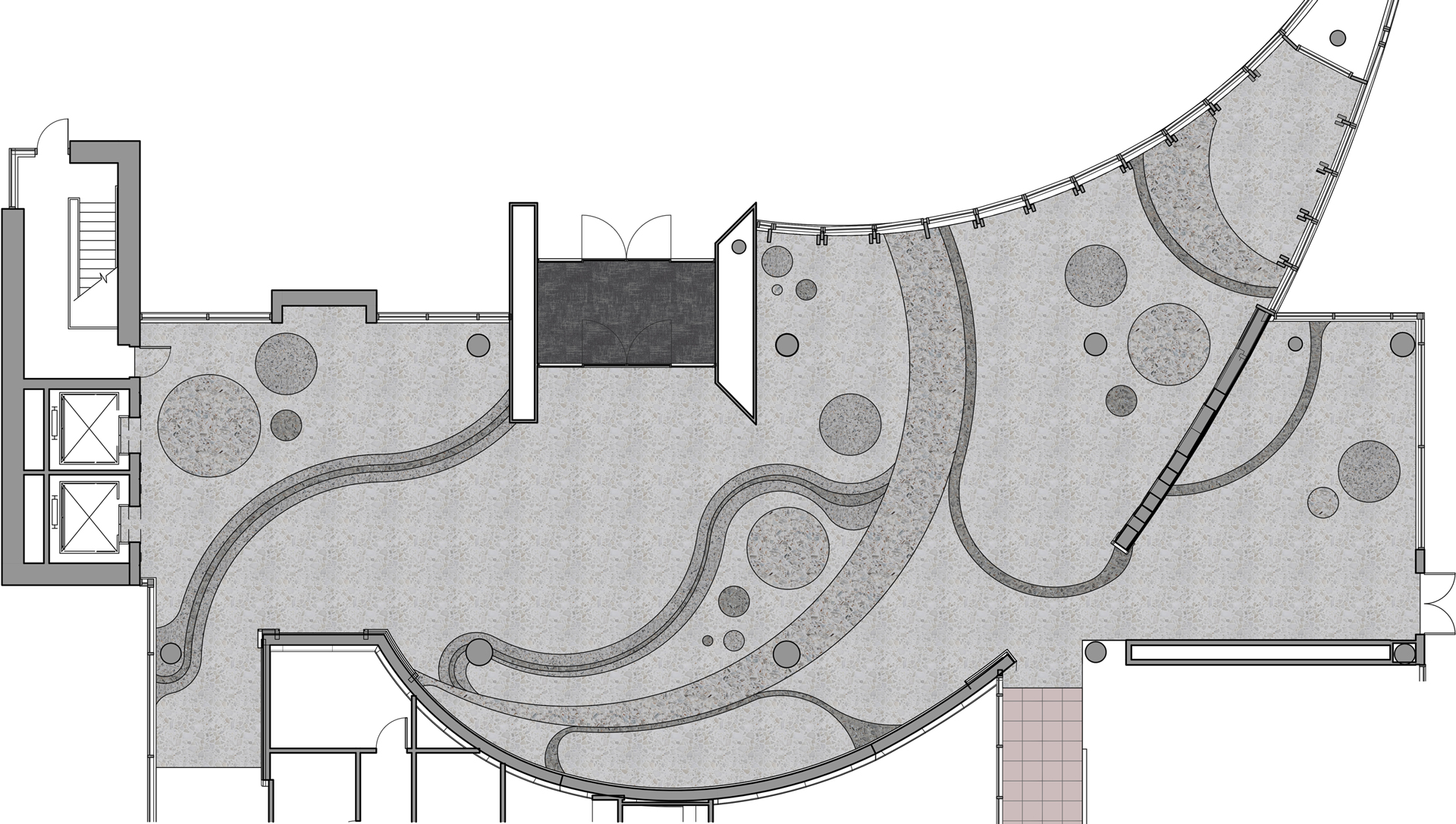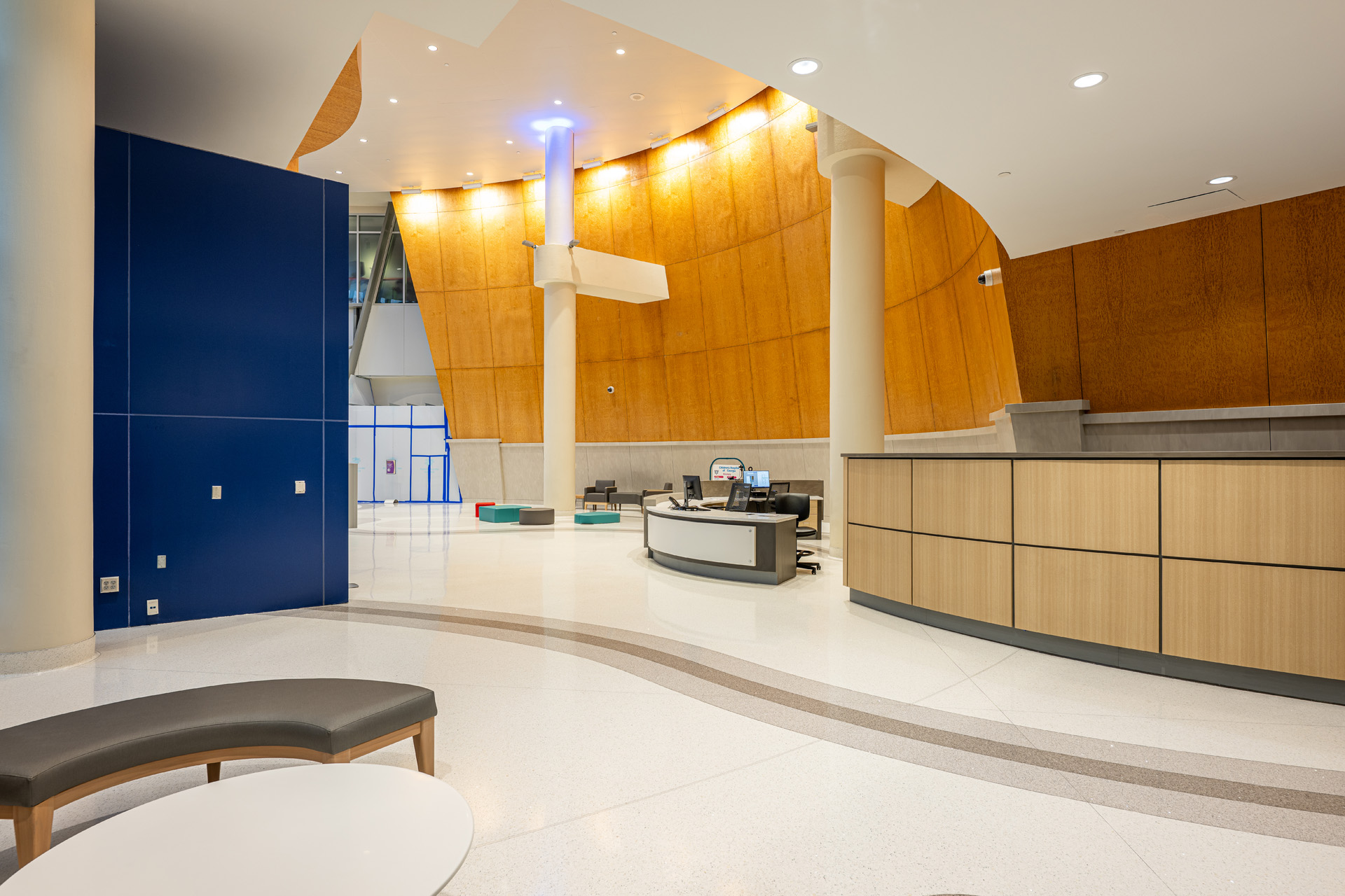 A new serpentine-pattern terrazzo floor guides visitors into and through the lobby, providing both a playful visual cue and a highly durable surface capable of withstanding hundreds of thousands of patient visits each year. The existing ceiling was replaced with a metallic, micro-perforated system that improves sound absorption while offering superior longevity in a demanding healthcare setting.